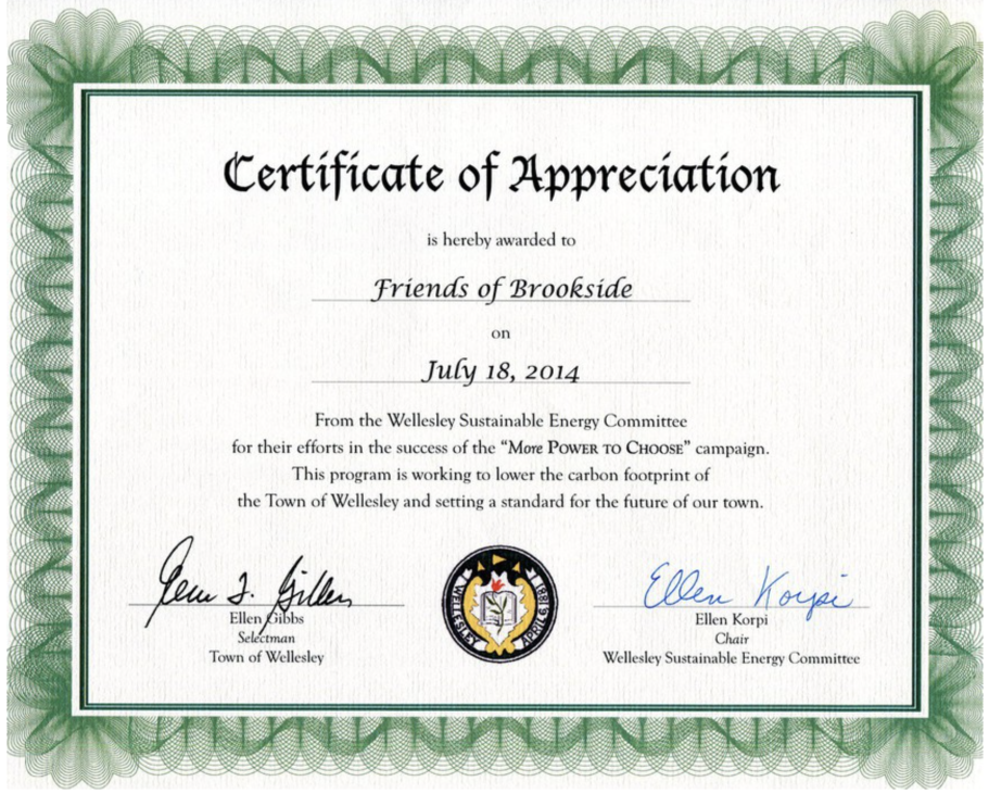 Friends of Brookside was pleased to be awarded a Certificate of Appreciation from Wellesley's Sustainable Energy Committee for our efforts to support the More Power to Choose campaign.