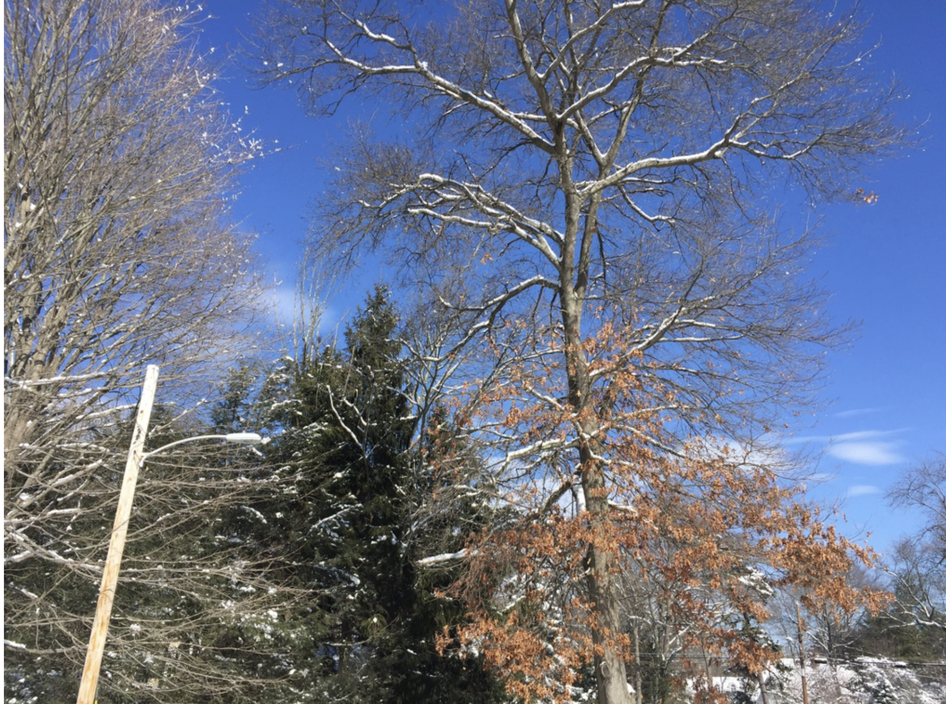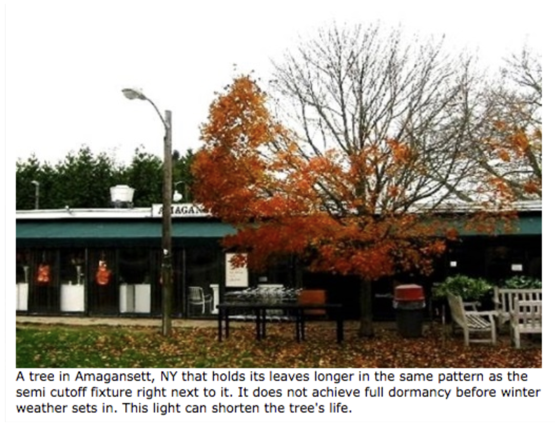 In these photos: a tree in Amaganset, NY, holds it leaves longer in the same pattern as the semi-cutoff fixture right next to it. It does not achieve full dormancy before the winter sets in, which can shorten its life. Note the street light proximity to the green leaves in the center photo. Finally, an oak tree in Wellesley holds the leaves exposed to the stree lamp into winter.