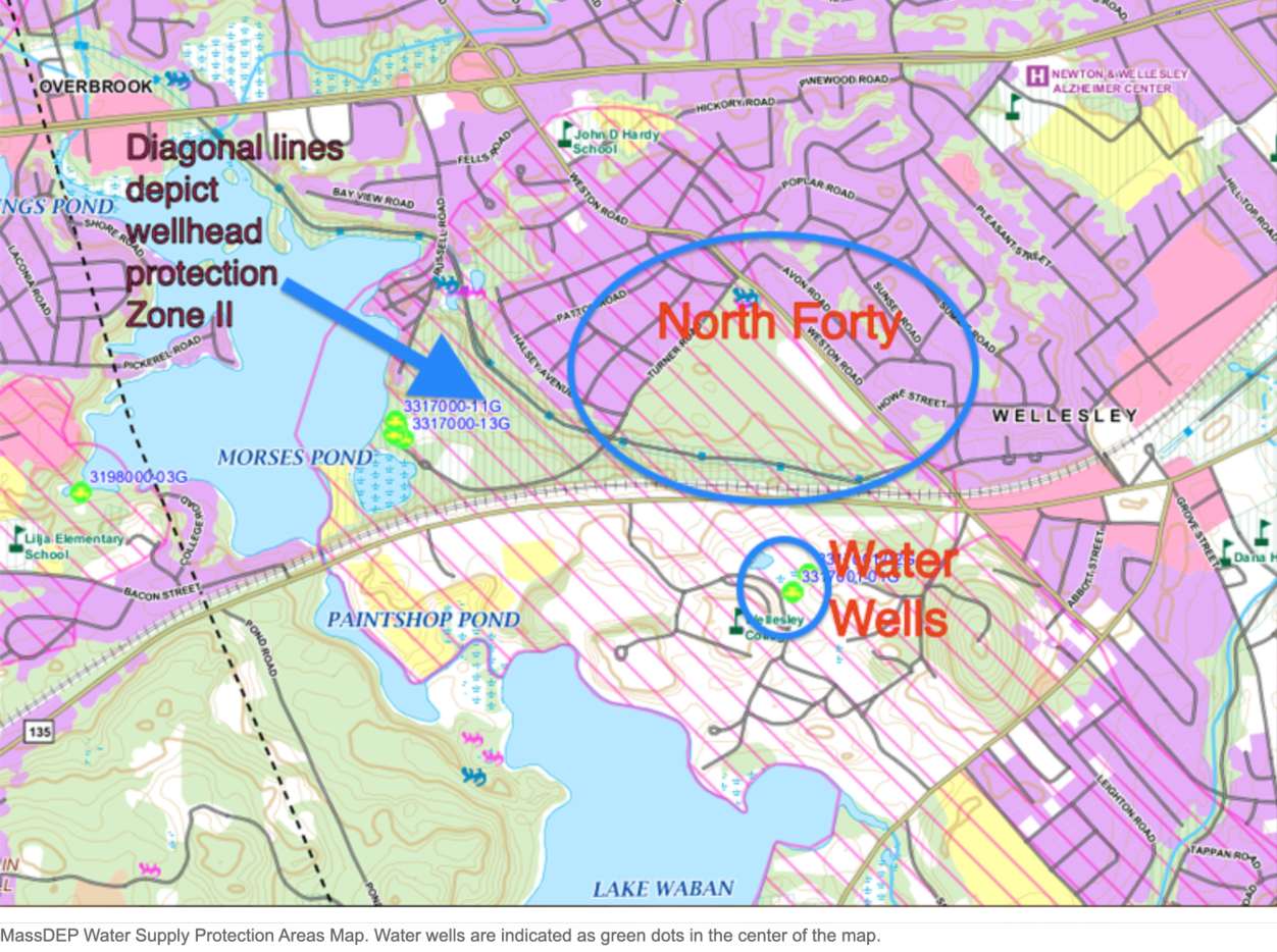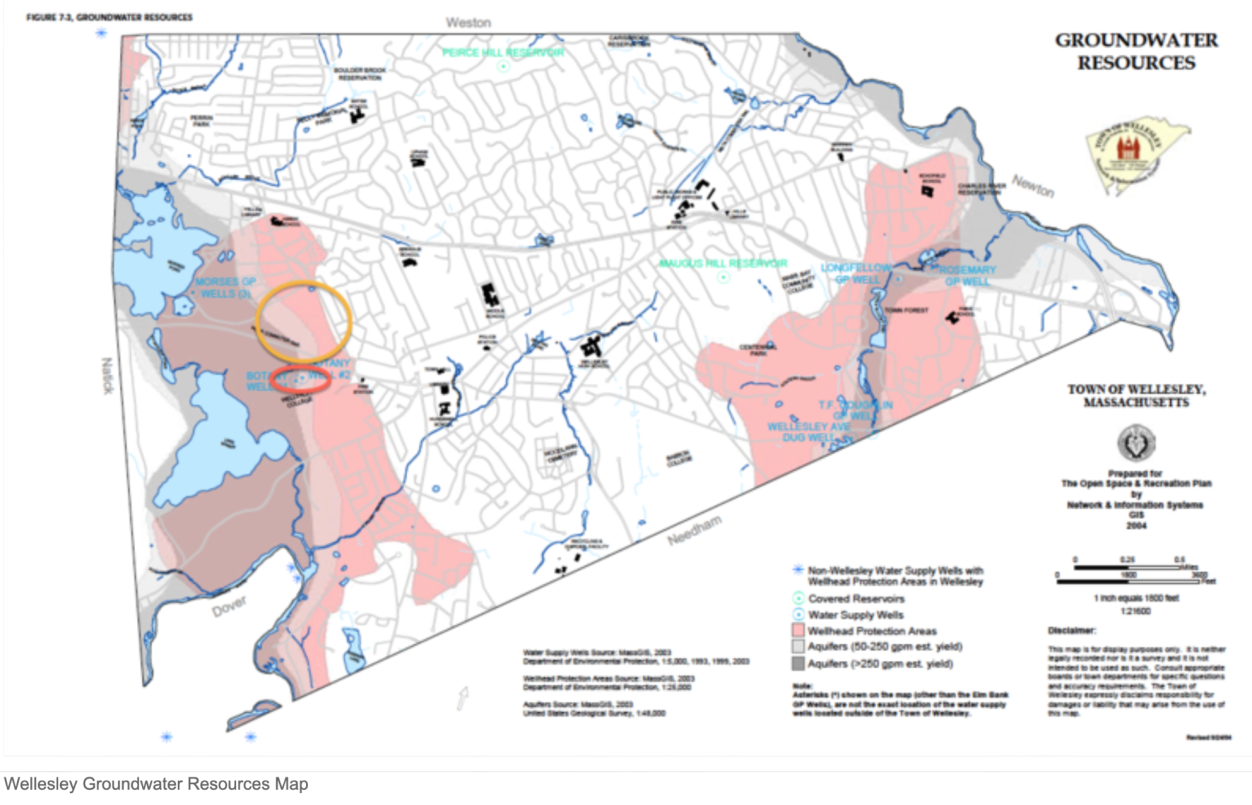 The yellow circle below shows the approximate area of the North 40. The red circle indicates the location of Wellesley College drinking water wells. The grey areas portray the aquifer, and the pink overlay area is the Wellhead Protection Area.